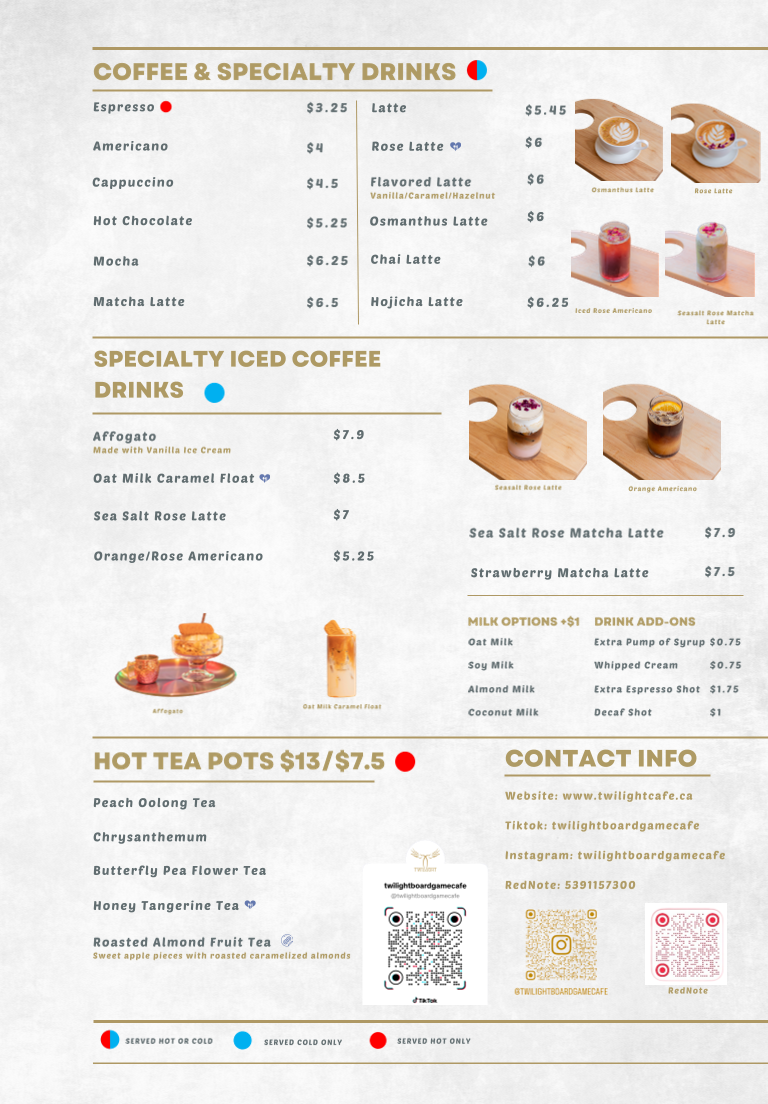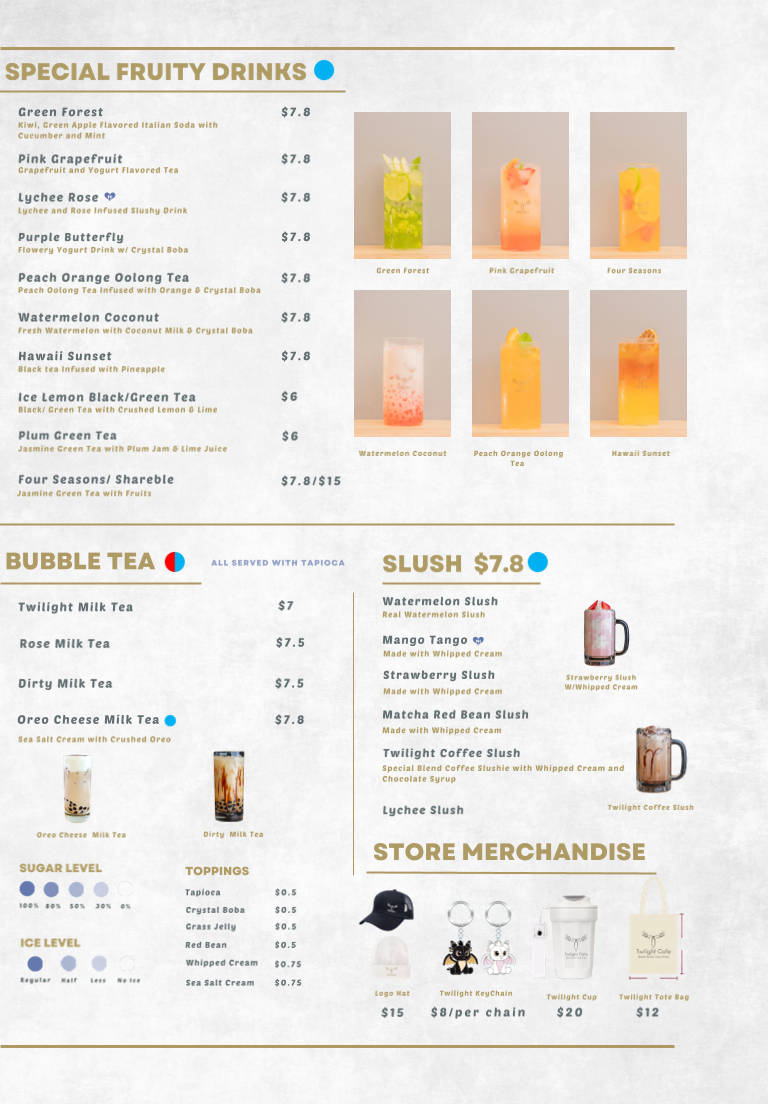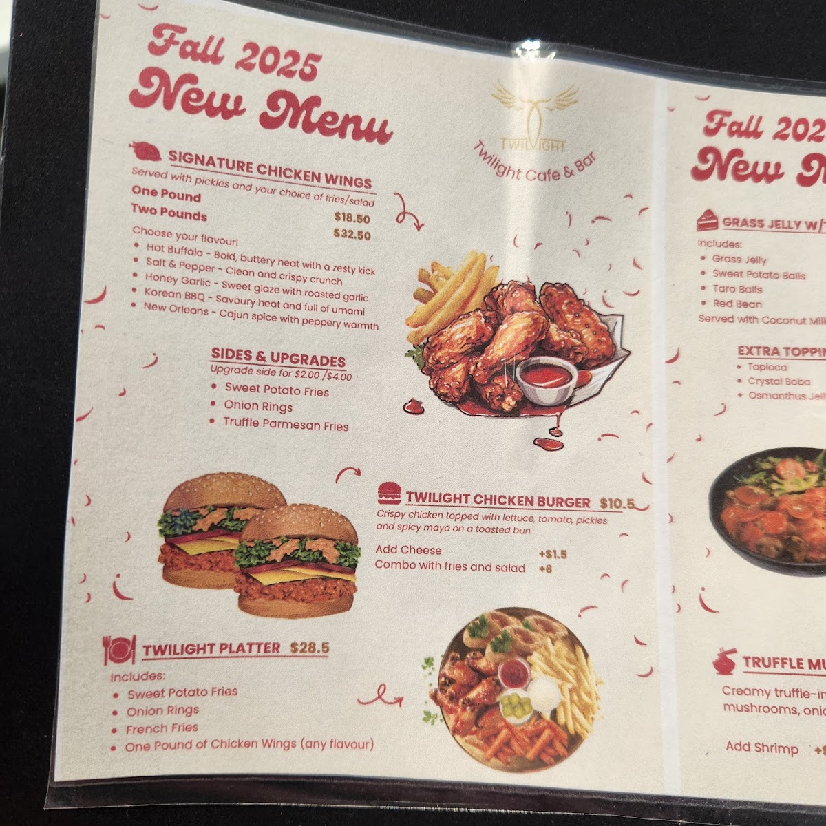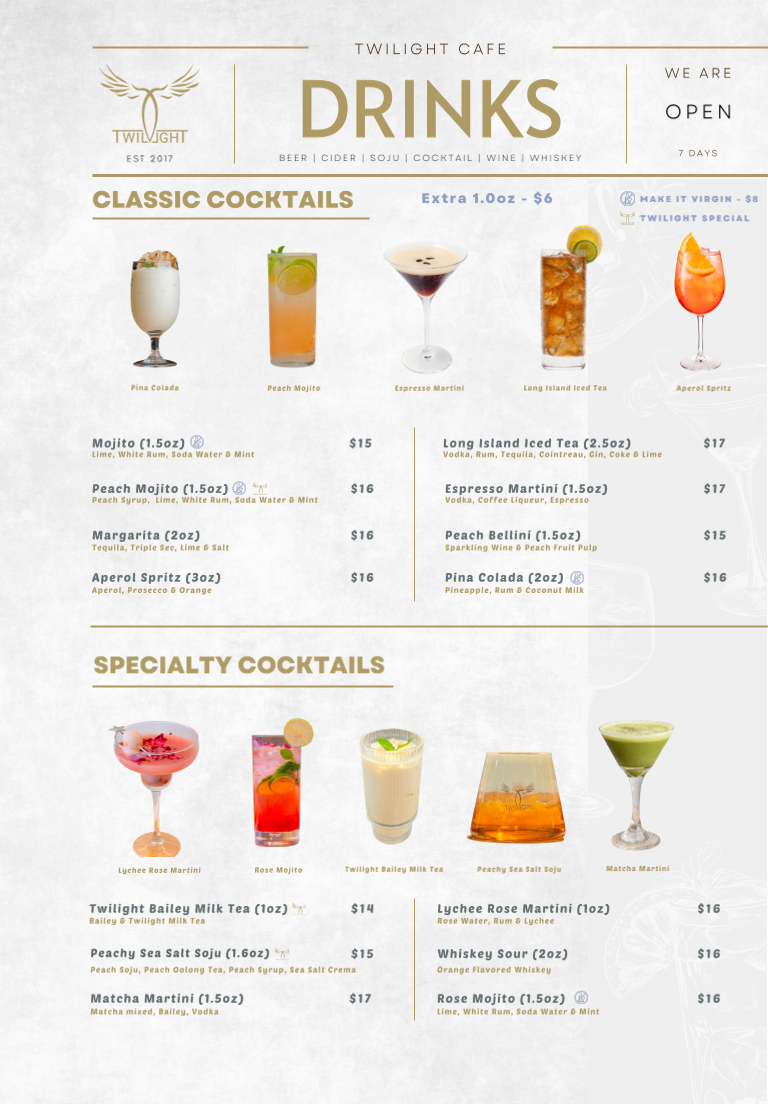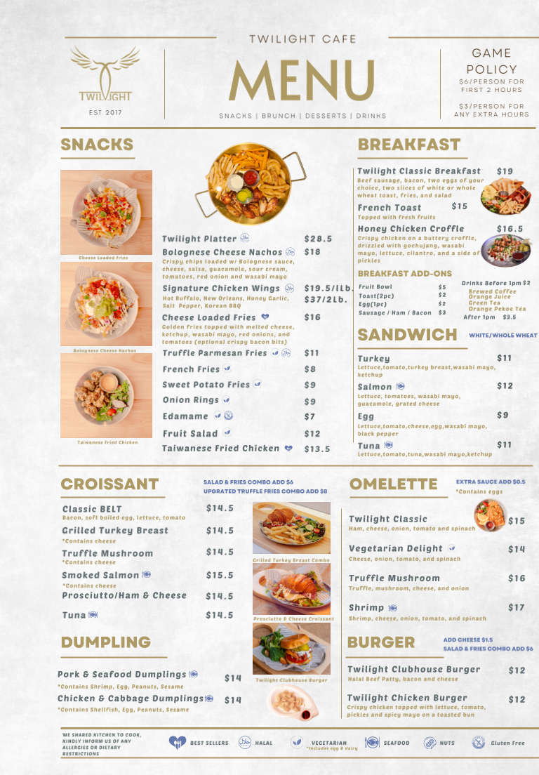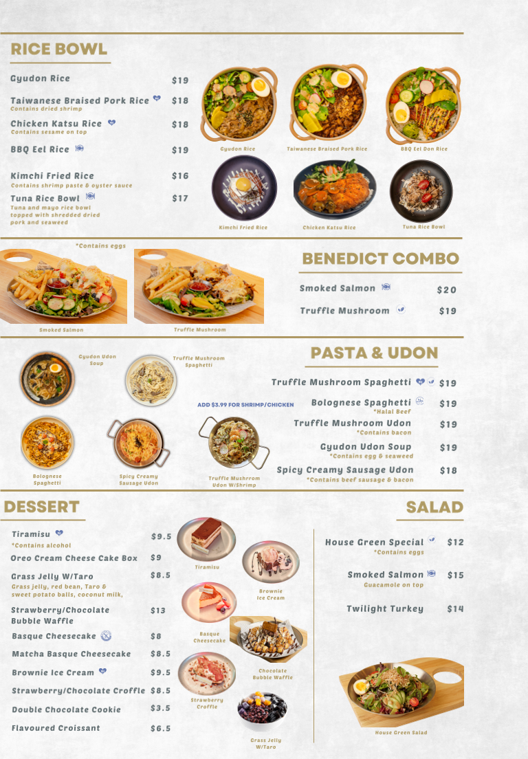From a reviewer’s perspective, the menu at Twilight Cafe & Bar offers a wide and satisfying variety that blends comfort food with café-style favorites, making it easy to find something for any craving. The Rice Ball Special combos like Tuna Sandwich Combo, Turkey Sandwich Combo, and Egg Sandwich Combo are great quick options, while snacks such as Twilight Platter, Bolognese Cheese Nachos, and Signature Chicken Wings are perfect for sharing. For heartier meals, dishes like Twilight Classic Breakfast, Twilight Truffle Mushroom Omelette, Truffle Mushroom Spaghetti, Gyudon Udon Soup, and Chicken Katsu Rice stand out as filling and flavorful choices. The menu also shines with desserts like Tiramisu and Strawberry Bubble Waffle, plus creative drinks such as Seasalt Rose Latte, Twilight Milk Tea, and Mango Tango Slush. Overall, the diverse selection-from Twilight Clubhouse Burger to Smoked Salmon Croissant and Pork Seafood Dumplings-makes the menu feel well-rounded, offering both café classics and unique specialty items that leave a strong final impression.